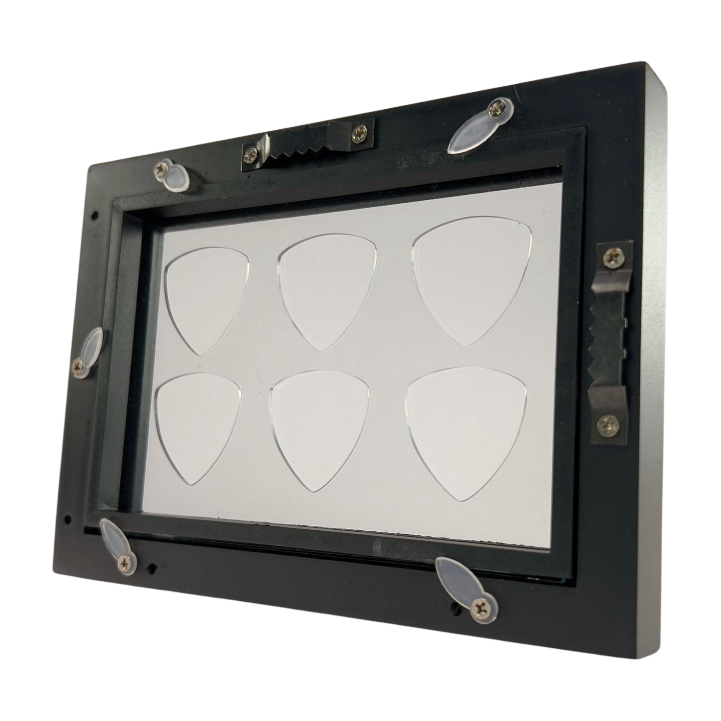 Crafted from CLEAR acrylic, Plectrum Spectrum GUITAR PICK DISPLAY inserts feature meticulously cut holes in the shape of #346 ROUNDED BASS guitar picks. It's easy – lay the frame face down, remove the back glass piece, position picks face down in the cut-out holes, add the backing glass, bracket and voila! DISPLAY! Each pick securely fits between the glass for a stunning presentation.