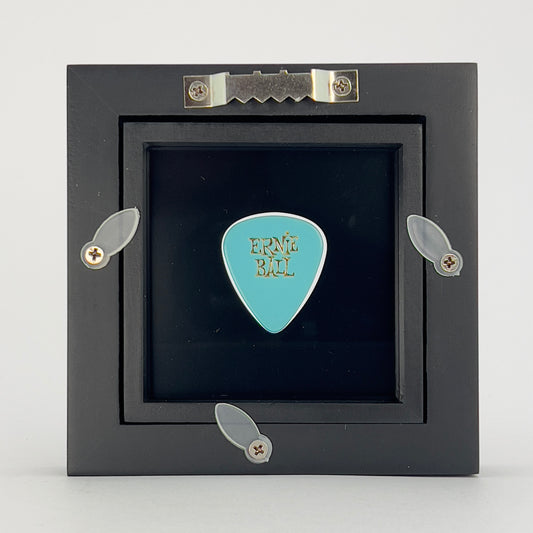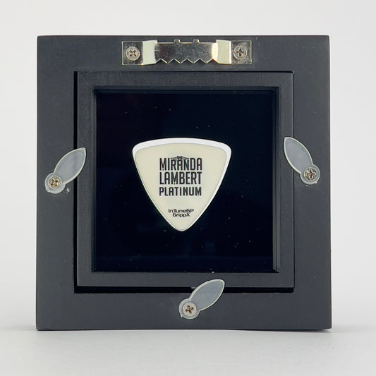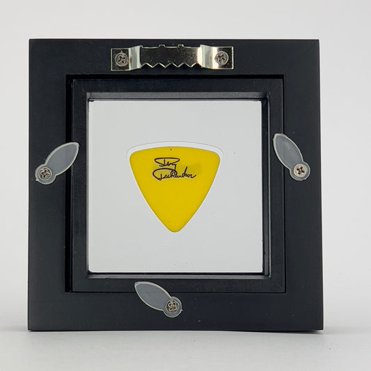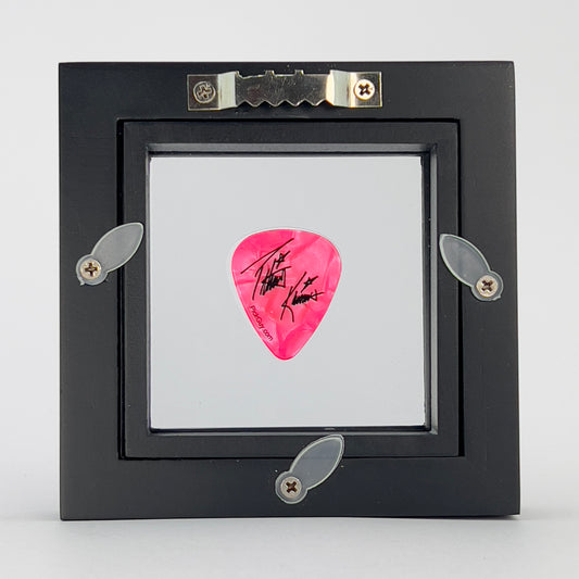 3" x 3" guitar pick displays for that one special pick! Available in clear and black to hold either a standard #351 shape pick, #346 round bass pick, or #346 triangle bass pick. Each frame is double sided so you may see both sides of your pick. The solid wood constructed frame is wide enough to sit on an even flat surface, or use the attached wall hangar for ease to hang on a wall.